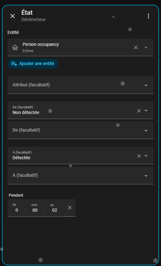 Donc l’automatisation sera déclenché si ce sensor passe de Non détectée à Détectée