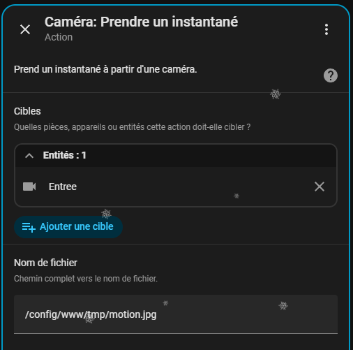 Sélectionne ta caméra, la mienne s’appelle Entree et en nom de fichier il faut indiquer le répertoire dans lequel tu veux que HA l’enregistre, il me semble que nous n’avons pas trop le choix car si non on aura pas sera bloqué pour l’afficher facilement (problème de droit).